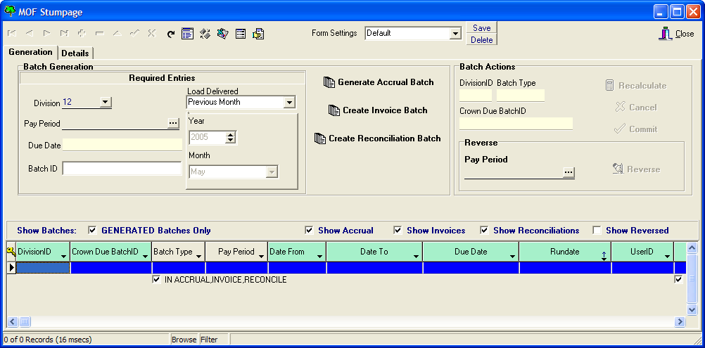 - Generates MoF Stumpage (accrual, invoice, and reconciliation batches)