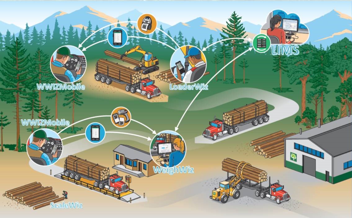 The process begins as a loader in the forest signs into LoaderWiz and scans a preprinted trip ticket barcode with the ticket number assigned in LIMS. The GPS coordinates are captured automatically based on the loader’s location. He or she then processes a load entering key information such as the source, destination, product, truck number, and load description. This information will be synchronized to LIMS (per the configured frequency and when internet connectivity is available). The loader then loads the truck and hands the driver a printed load slip with a scannable QR barcode or transmits the ticket electronically if the driver is using WeighWiz Mobile. The truck driver then takes the printed ticket (if applicable) and delivers the load to the destination. When at the mill or customer site, the truck driver may initiate the weigh in process by either scanning the printed load slip with barcode or, if using WeighWiz Mobile, weighs in from his/her device without leaving the truck. Fields in WeighWiz are populated automatically based on the scanned barcode, thereby expediting data entry. Once the truck has weighed out, the completed load with weight and other information is synchronized to LIMS.